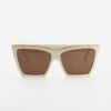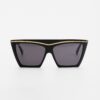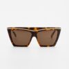 La montatura, in acetato di cellulosa Mazzucchelli, è impreziosita da una lamina metallica che ne sottolinea la linea superiore, donando luminosità e un tocco di eleganza architettonica. Le forme geometriche e l’ampiezza delle lenti enfatizzano il carattere sofisticato del modello, ideale per chi cerca un accessorio che non passi inosservato.